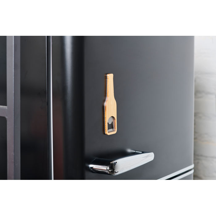 Abrebotellas magnético de acero inoxidable con superficie de bambú.