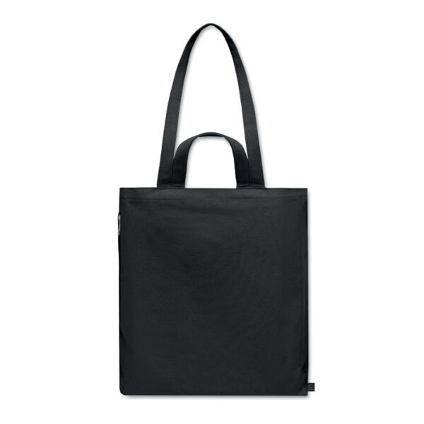 Bolsa de compra o de playa de poli algodón reciclado (70% algodón reciclado, 30% poliéster reciclado) con asas cortas. Tiene un bolsillo lateral con cremallera. 380 gr/m².