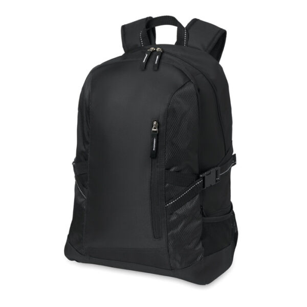 Mochila para portátil de 15 ”en 600D con detalles de rip stop. Incluye un compartimiento para portátil de 15”, un bolsillo frontal con cremallera y 2 compartimentos laterales.