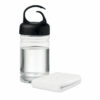 Toalla deportiva de microfibra, presentada en envase individual de PET transparente con tapa con mosquetón de transporte integrado. Capacidad de la botella = 300 ml. Tamaño de la toalla = 30 x 80 cm.