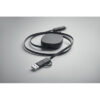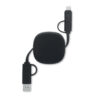 Cable de carga retráctil de 60W. Carcasa de ABS reciclado. Entrada: 2 en 1 Tipo-C y Tipo-A. Salida: Tipo-C y micro-B (2 en 1 clavija). Longitud del cable: 80 cm.