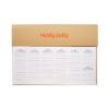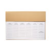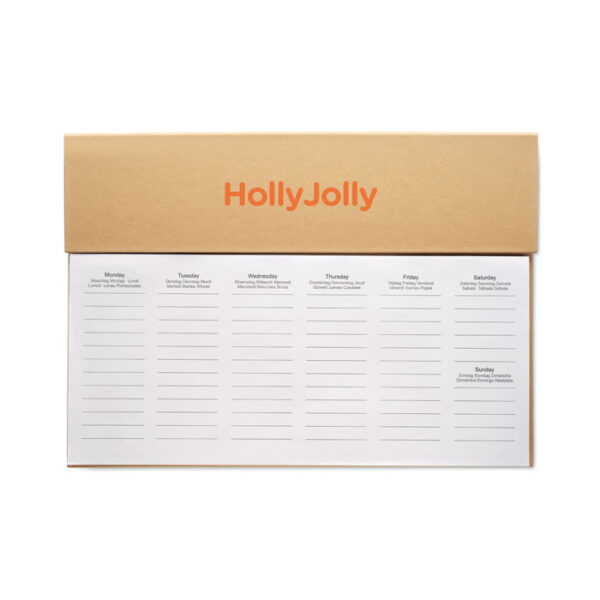 Planificador semanal de mesa de 125 páginas en 6 idiomas (EN/DE/FR/ES/IT/NL/PL) con cubierta de papel kraft, cartón, barril de cartón, bolígrafo de tinta azul, regla de madera y bloc de notas adhesivas.