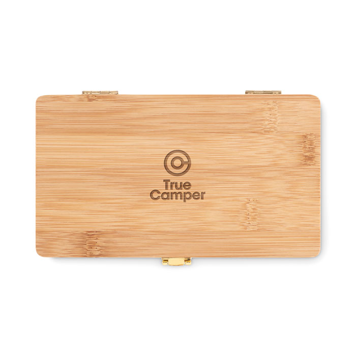 Set de herramientas con 21 piezas presentado en un estuche de bambú que contiene 3 destornilladores, 10 cabezales, 3 planos, 3 Torx y 1 adaptador, 4 llaves de vaso , 1 cúter, 1 carraca y 1 prolongador de carraca. FSC®-certified | FSC 100%, N5.7, FSC-C213206