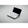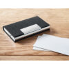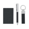Set de regalo de 3 piezas en caja de regalo. Incluye bolígrafo metálico con detalle de poliéster RPET, llavero de poliéster RPET y tarjetero de poliéster RPET con placa metálica. Tinta azul.