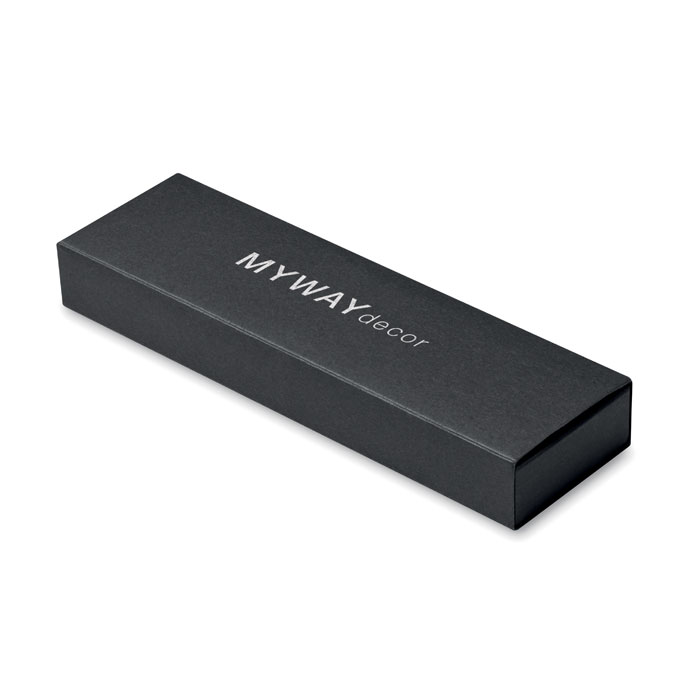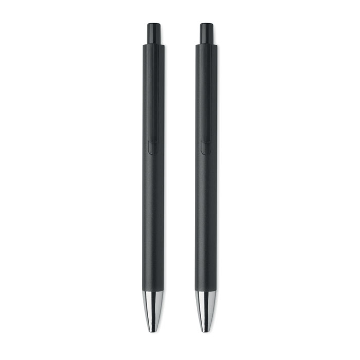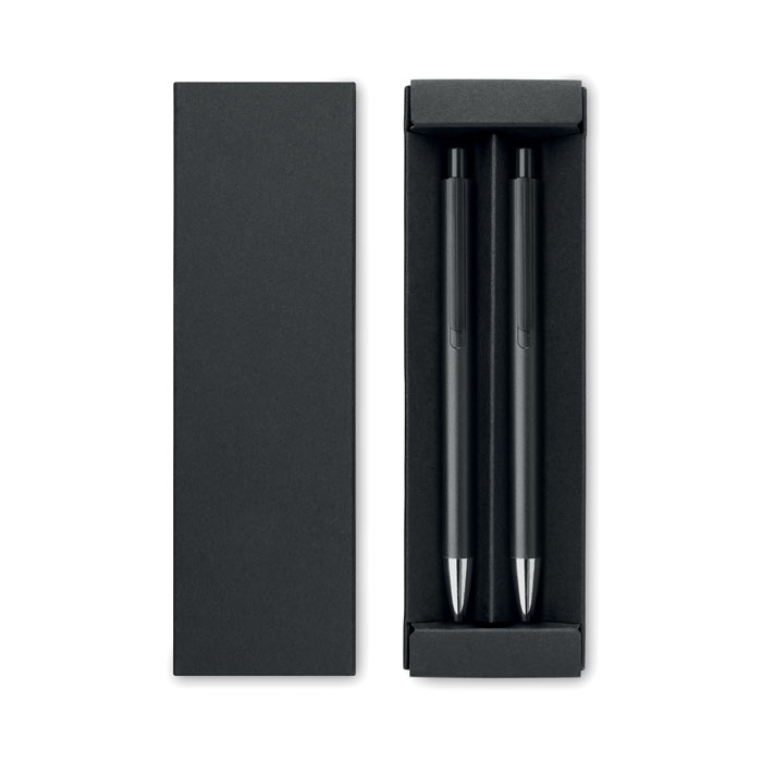 Set de bolígrafo de aluminio reciclado con 1 bolígrafo de pulsador y 1 bolígrafo de grafito sin tinta. Tinta azul. Presentado en caja de papel reciclado.