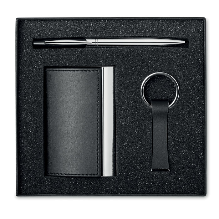 Set de regalo compuesto por bolígrafo metálico con tinta negra, llavero y tarjetero metálicos con combinación de PU.
