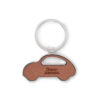 Llavero metálico en forma de coche con incrustación de cuero sintético reciclado.