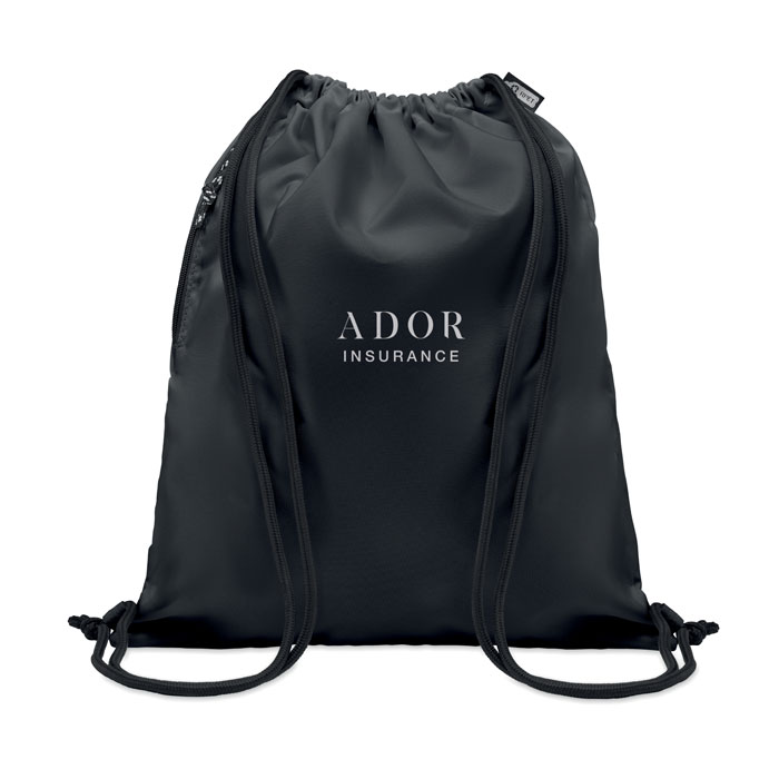 Bolsa grande de cuerdas en poliéster RPET 300D con bolsillo exterior lateral con cremallera. Cordones gruesos.