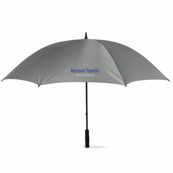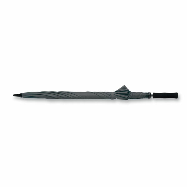 Paraguas de 30 inch con apertura manual, antiviento, con mango recto de EVA negro. Eje y costillas de fibra de vidrio, puntas de plastico. Poliéster 190T. Cierre manual.