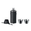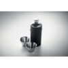 Petaca de acero inoxidable con superficie de cuero de PU y 2 vasos de chupito de acero inoxidable de 20 ml en la tapa. Capacidad: 230 ml.