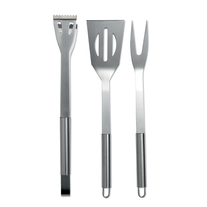 Set de 3 herramientas para barbacoa en acero inoxidable con funda de non woven con cremallera. Incluye pinzas, espátula y tenedor para barbacoa.