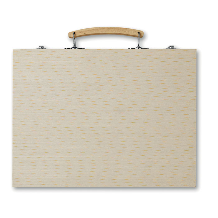 Set de pinturas en caja de madera. 66 piezas (ceras, rotuladores, lápices de colores, acuarelas, pegamento, goma de borrar, pincel, regla y lápiz).