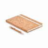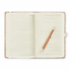 Cuaderno de corcho A5 con bolígrafo a juego. Cubierta de corcho duro. Encuadernado. 160 páginas de papel reciclado rayado (80 hojas). Correa elástica de cierre y portabolígrafos. Bolígrafo con pulsador a juego con cuerpo de corcho y detalles 50% paja de trigo y 50% PP. Presentado en caja de regalo.