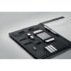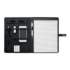 Porta folios A4 en lino PU con cierre. Incluye cargador inalámbrico (Output DC5V / 1A) y powerbank de 4000 mAh, con un conector micro USB a Tipo C. Incluye un bloc de notas de 20 páginas y varios bolsillos internos. Este artículo incluye una placa de aluminio negra ideal para su logotipo.