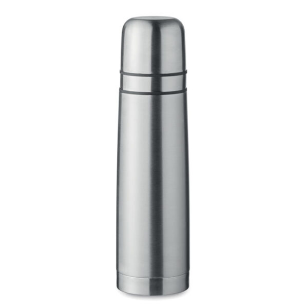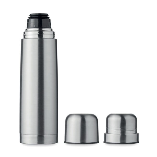 Termo de doble pared de acero inoxidable reciclado y aislado al vacío (90% de acero inoxidable reciclado y 10% de acero inoxidable) con 2 tazas en la tapa (pared interior de PP). Capacidad: 750 ml, vaso exterior 150ml, vaso interior: 125ml.